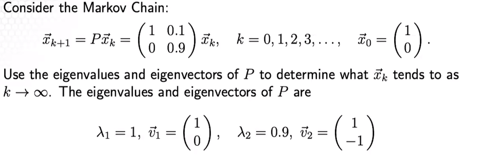 xk+1โx0โx1โx1โx1โx2โx1โxkโโ=Pxkโ=c1โv1โ+c2โv2โ=Px0โ=P(c1โv1โ+c2โv2โ)=c1โฮป1โv1โ+c2โฮป2โv2โ=Px1โ=P(c1โฮป1โv1โ+c2โฮป2โv2โ)=c1โ(ฮป1โ)kv1โ+c2โ(ฮป2โ)kv2โโ=c1โPv1โ+c2โPv2โ=c1โ(ฮป1โ)2v1โ+c2โ(ฮป2โ)2v2โโ