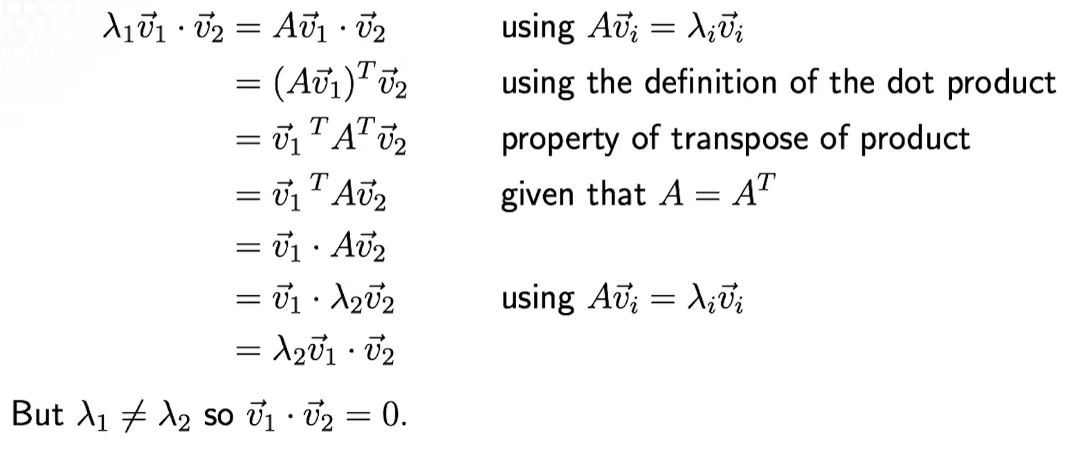 If is a symmetric matrix, with eigenvectors and corresponding to two distinct eigenvalues, then and are orthogonal.