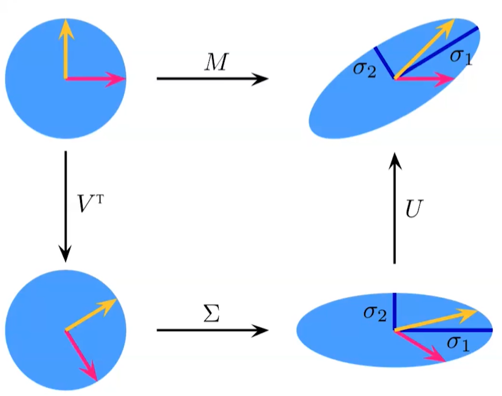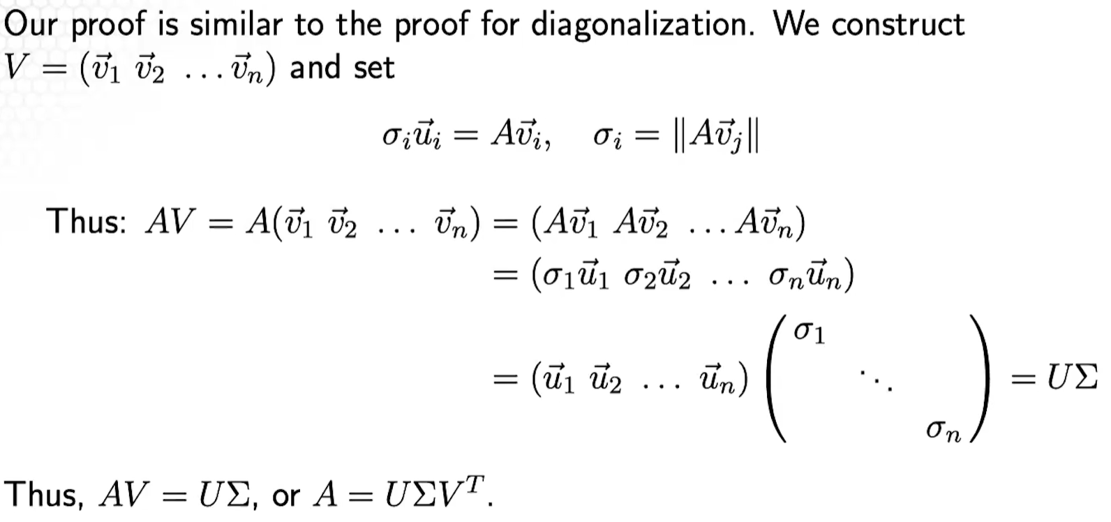 Suppose is an matrix with singular values and . Then has the decomposition where, \Sigma = \b{D\\0_{m-n,n}} \quad \quad D=\b{\sigma_1 &0 & \dots &0 \\ 0 & \sigma_2 & \dots & 0 \\ \vdots & \vdots & \ddots & \vdots \\ 0 &0&\dots & \sigma_n} is a orthogonal matrix, and is a orthogonal matrix. If then \Sigma= \b{D & 0_{m,n-m}}^T with everything else being the same.